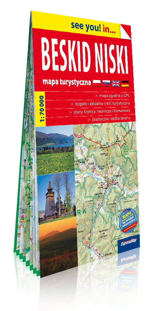 Doliny nieistniejących już wsi, Diabli Kamień, drewniany kościół w Sękowej i cerkiew w Kwiatoniu to tylko niektóre atrakcje Beskidu Niskiego. Nasza papierowa mapa pomoże w odkrywaniu uroków tych najdzikszych polskich gór. Publikacja została opracowana we współpracy z doświadczonymi krajoznawcami z regionu. Cechy mapy: - dogodna zarówno dla pieszego, jak i rowerzysty, skala 1:70 000 (1 cm – 700 m), - bogata treść turystyczna, - zgodność z GPS – współrzędne geograficzne w układzie WGS-84. Na mapie m.in.: - szlaki piesze i czasy przejść, szlaki rowerowe, ścieżki dydaktyczne, - schroniska młodzieżowe, kempingi, pola namiotowe, hotele i pensjonaty, - muzea, zabytki i inne interesujące obiekty, - parki narodowe i krajobrazowe, rezerwaty przyrody, atrakcje przyrodnicze, - cieniowanie plastycznie pokazujące ukształtowanie terenu, - plany Krynicy, Iwonicza i Rymanowa , - 4 panoramy z najwybitniejszych szczytów.