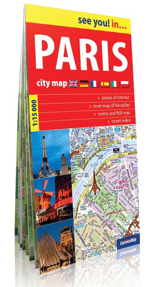 Plan miasta w pełnych granicach administracyjnych , szczegółowa skala 1:15 000 (1 cm - 1350 m) , bogata treść turystyczna, m.in.: zabytki, muzea, hotele i inne istotne obiekty , linie i stacje metra oraz kolejki miejskiej RER , plan Wersalu , schemat metra i kolejki miejskiej RER zestrefami biletowymi , skorowidz ulic.