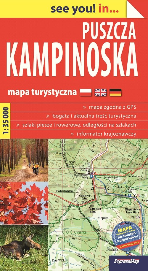 Spacer, wycieczka rowerowa lub na nartach biegowych, a może wyprawa śladami łosia? Wśród torfowisk, wydm i leciwych drzew Puszczy Kampinoskiej wytyczono wiele ciekawych szlaków. Mapa tego obszaru pomoże zaplanować udany wypoczynek. Publikacja powstała we współpracy z doświadczonymi krajoznawcami z regionu.Mapa zawiera bogatą treść turystyczną, m.in.:drogi dopuszczone do ruchu na terenie Kampinoskiego Parku Narodowego,szlaki piesze i rowerowe, odległości w kilometrach na szlakach,schroniska młodzieżowe, gospodarstwa agroturystyczne, pola namiotowe, hotele,muzea, zabytki i inne interesujące obiekty,obszary ochrony ścisłej, obszary ochrony krajobrazowej,atrakcje przyrodnicze,informator krajoznawczy.Cechy mapy:dogodna zarówno dla pieszego, jak i rowerzysty,zgodna z GPS współrzędne geograficzne w układzie WGS-84,zawiera cieniowanie plastycznie pokazujące ukształtowanie terenu.Jakość w przystępnej cenie. Do tradycyjnych map papierowych dołączamy plastikowe etui, które chroni mapę przed wilgocią i uszkodzeniem. Seria obejmuje zarówno mapy samochodowe oraz plany miast, jak i mapy turystyczne.