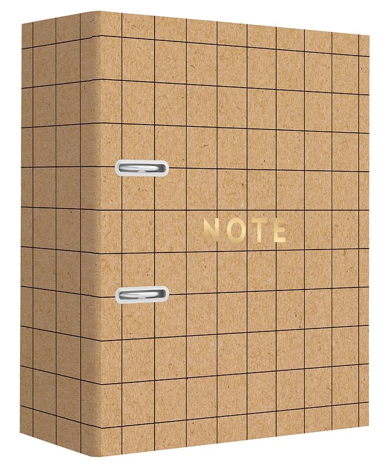 Segregator w formacie A4. Szerokość grzbietu: 75 mm. Okładka wykonana z eleganckiego i trwałego kartonu kraft zezłotymi elementami w technologii hot-stamping. W środku papierowa wyklejka. Wyposażony w 2 ringi oraz dźwignię z dociskaczem.