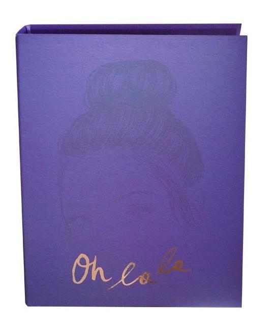 Segregator w formacie A4, koloru fioletowego z motywem dziewczyny oraz złotym napisem Oh la la.