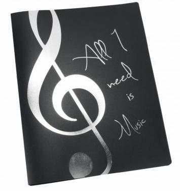 Elegancki segregator w formacie A4, ze srebrnym nadrukiem ""All I Need Is Music"". W środku znajduje się 20 koszulek na dokumenty.