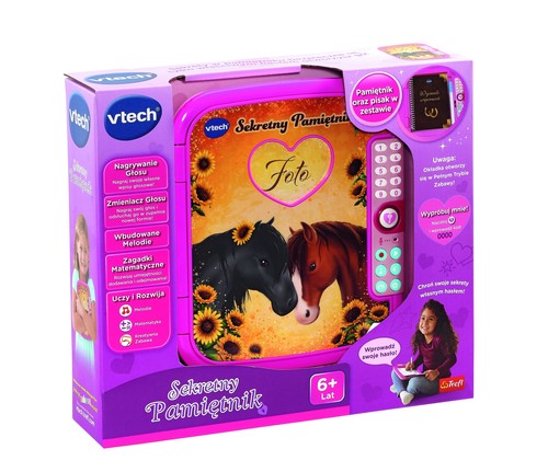 Z Sekretnym Pamiętnikiem marki VTech wszystkie tajemnice będą bezpieczne! Na okładce znajduje się miejsce na zdjęcie właścicielki, a środku przestrzeń na jej sekrety, które można zabezpieczyć czterocyfrowym hasłem. W zestawie oprócz notesu-pamiętnika znajdziesz kolorowy pisak oraz tajemniczy schowek na Twoje skarby! Zabawka posiada wbudowaną możliwość nagrywania głosu i odtwarzania nagrań. Dodaj zabawne efekty dźwiękowe do swoich wyznań, dzięki zmieniaczowi głosu. Z Pamiętnikiem możesz również rozwijać swoje zdolności matematyczne! Sprawdź, czy dodawanie i odejmowanie to Twoja mocna strona. Dla dzieci w wieku od 6 lat