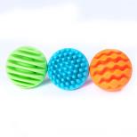 Zestaw 3 silikonowych, kolorowych, pięknych kul o różnorodnej fakturze z delikatnymi dzwoneczkami w środku. Wspaniała sensoryczna przygoda dla maluszka. Każda kula ma dwie różne faktury powierzchni, razem sześć wzorów. W kulach znajdują się dzwoneczki, delikatnie dzwoniące przy każdym ruchu, aby dodatkowo stymulować dziecko. Wielkość kul dostosowana jest do małych rączek. Kule wykonane są z wysokiej jakości silikonu, bez BPA, bezpieczne dla ząbkujących dzieci. Można myć w zmywarce.