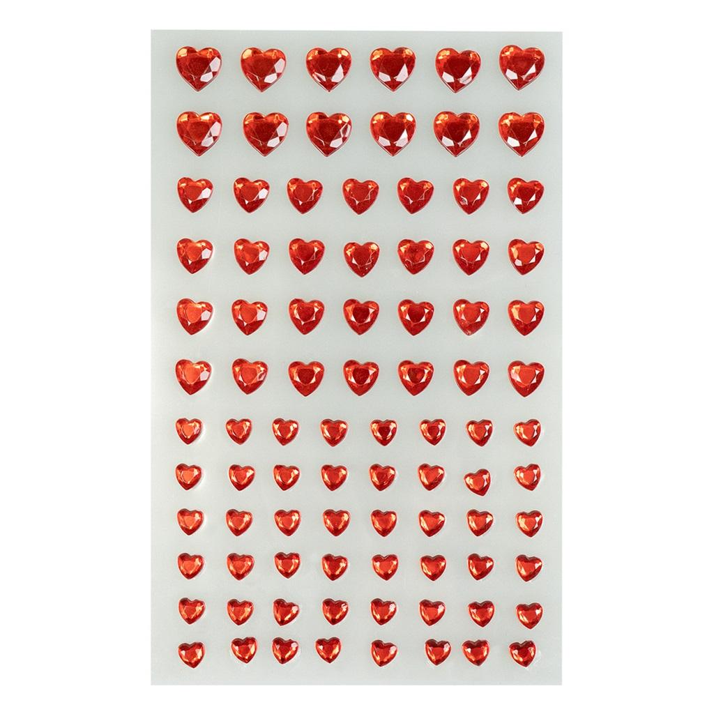 Dekoracyjne kryształki w kształcie serduszek. Ozdobne diamenciki samoprzylepne w kolorze czerwonym, mix rozmiarów do prac kreatywnych, szkolnych, dekoracji kartek urodzinowych, zaproszeń, albumów ze zdjęciami, przedmiotów. 84 sztuki na blistrze o wymiarze 12 cm x 25 cm.