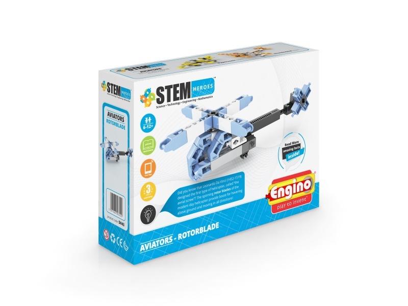 Zestawy klocków STEM Heroes, seria Awiacja, umożliwiające zbudowanie 1 modelu z każdego zestawu, ulotka informacyjna dotycząca tematyki danego zestawu, bezpłatna aplikacja do ściągnięcia z Internetu. Zestawy łączą się, po zebraniu trzech zestawów można zbudować model combo'.