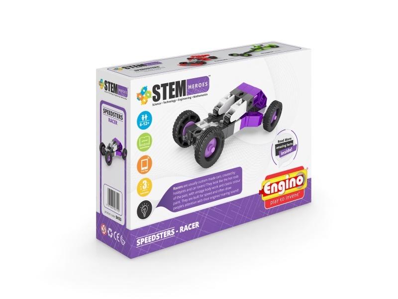 Zestawy klocków STEM Heroes, seria Pojazdy wyścigowe, umożliwiające zbudowanie 1 modelu z każdego zestawu, ulotka informacyjna dotycząca tematyki danego zestawu, bezpłatna aplikacja do ściągnięcia z Internetu. Zestawy łączą się, po zebraniu trzech zestawów można zbudować model combo'.