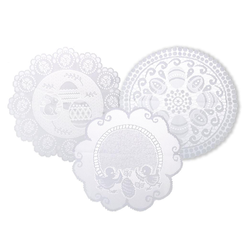 Wielkanocna serwetka dekoracyjna na koszyczek. Serwetka osłania żywność w koszyczku oraz pełni formę świątecznej dekoracji. Ażurowe wzory nawiązują to tradycyjnych motywów. Duża serwetka o średnicy 40 cm. Dostępne 3 wzory.