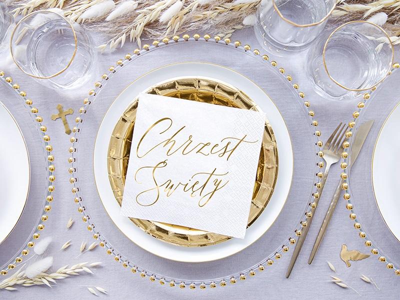 Serwetki papierowe w kolorze białym ze złotym metalizowanym napisem Chrzest Święty, wymiary po rozłożeniu ok. 33 x 33 cm, wymiary po złożeniu ok. 16.5 x 16.5 cm.(1 op. / 20 szt.)