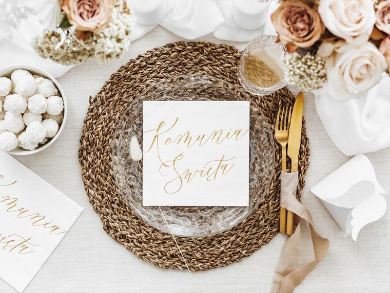 Serwetki papierowe w kolorze białym ze złotym metalizowanym napisem Komunia Święta, wymiary po rozłożeniu ok. 33 x 33 cm, wymiary po złożeniu ok. 16.5 x 16.5 cm.(1 op. / 20 szt.)