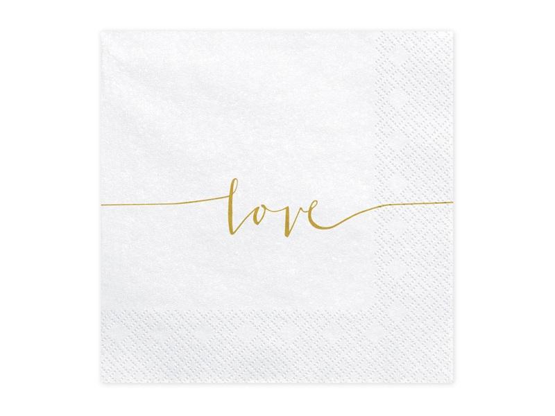 Serwetki trójwarstwowe w kolorze białym ze złotym napisem Love, wymiary po rozłożeniu ok. 33 x 33 cm, wymiary po złożeniu ok. 16,5 x 16,5 cm.(1 op. / 20 szt.)