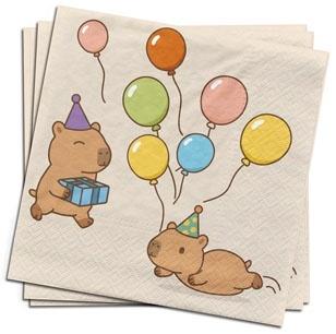 Serwetki papierowe z motywem kapibary to uroczy element dekoracyjny, który doskonale uzupełnia modny zestaw przyjęciowy inspirowany kapibarami. Autorski wzór przedstawia małe kapibarki przygotowujące się do przyjęcia na jasnym tle, co podkreśla lekkość i radosny charakter dekoracji. Popularność kapibary sprawia, że serwetki stają się nie tylko praktycznym dodatkiem, ale także stylową ozdobą stołu.