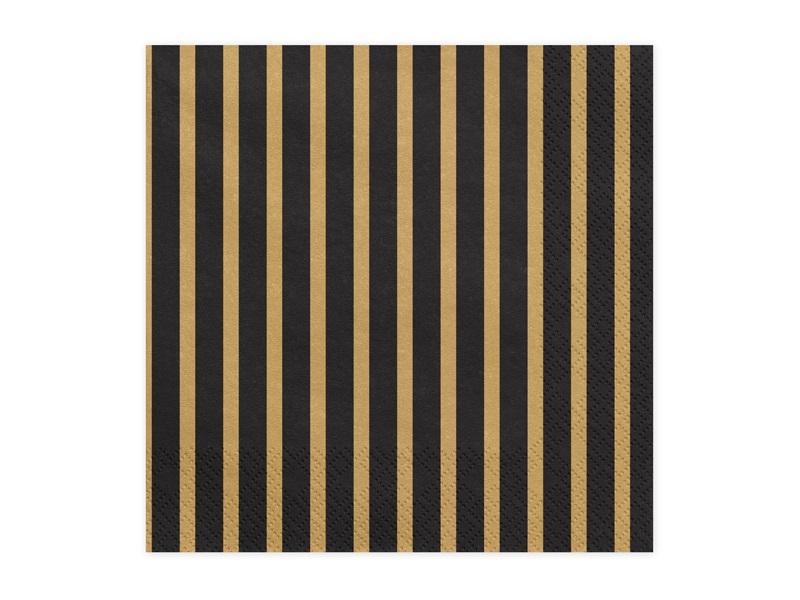Serwetki papierowe w kolorze czarnym ze złotymi paskami, wymiary po rozłożeniu ok. 33 x 33 cm, wymiary po złożeniu ok. 16,5 x 16,5 cm.(1 op. / 20 szt.)