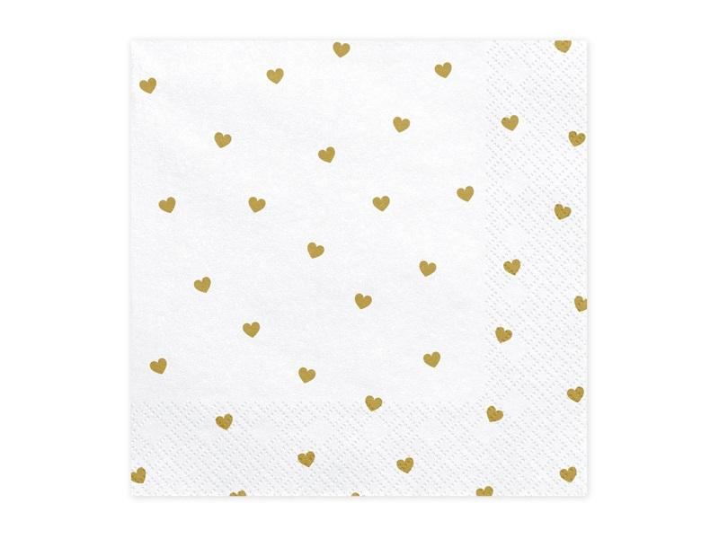 "Serwetki papierowe Serca w kolorze białym ze złotym nadrukiem, wymiary po rozłożeniu ok. 33 x 33 cm, wymiary po złożeniu ok. 16,5 x 16,5 cm. (1 op. / 20 szt.)"