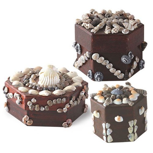 Zestaw trzech pudełeczek do dekorownaia z wykorzystaniem morskich muszli. Zabawka kreatywna dla dzieci powyżej lat 8.
