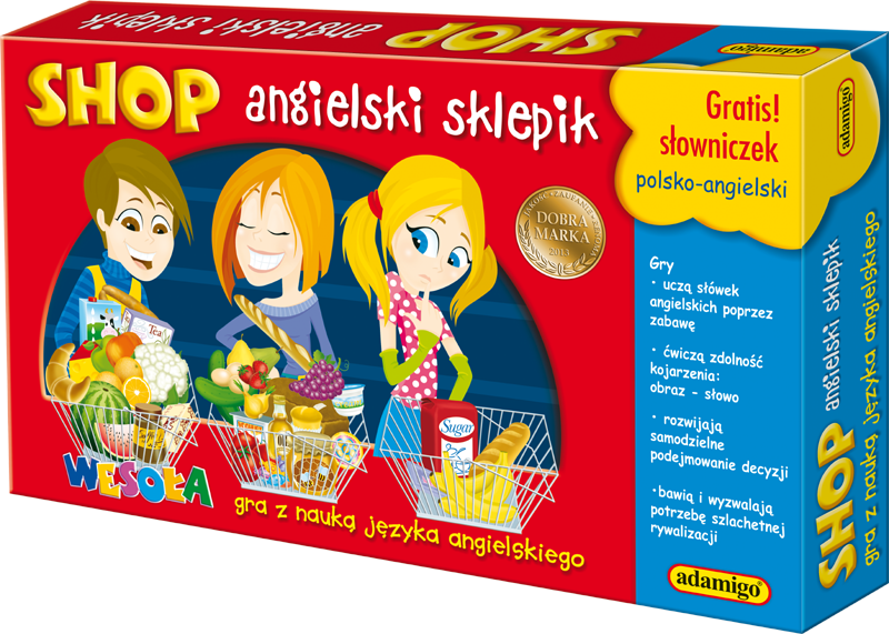 Jeśli chcesz, aby Twoje dziecko rozwijało swoją pamięć, zdolność kojarzenia, a jednocześnie uczyło się języka angielskiego poprzez zabawę, to gra edukacyjna „Shop - angielski sklepik” na pewno spełni te wszystkie wymogi. Celem gry jest nauka angielskich słówek, za pomocą skojarzeń: obraz, zapis, wymowa. Zestaw zawiera między innymi dużą, dwustronną planszę, 70 kolorowych kartoników, a także piękny słowniczek z nazwami produktów spożywczych wraz z uproszczonym zapisem fonetycznym, tak aby ułatwić dzieciom naukę wymowy angielskich słówek. Wspaniała gra edukacyjna, która rozwija umiejętności językowe dziecka. Zestaw gry zawiera: - 70 kolorowych kartoników, - słowniczek z nazwami produktów spożywczych. Gra dla 1-4 graczy. Wiek: 4+