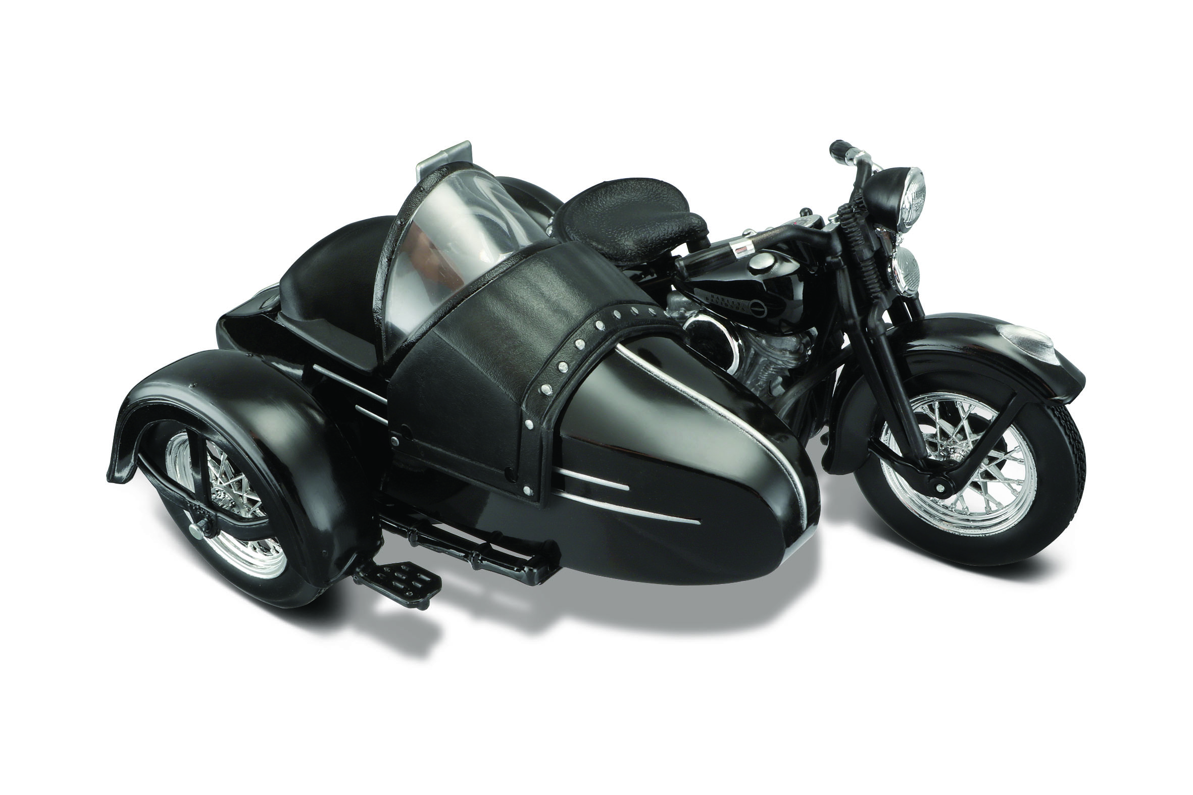 Motocykl Harley-Davidson z wózkiem bocznym w skali 1:18. Metalowy odlew z plastikowymi częściami. Skrętne przednie koło i kierownica. Wiek: 3+.