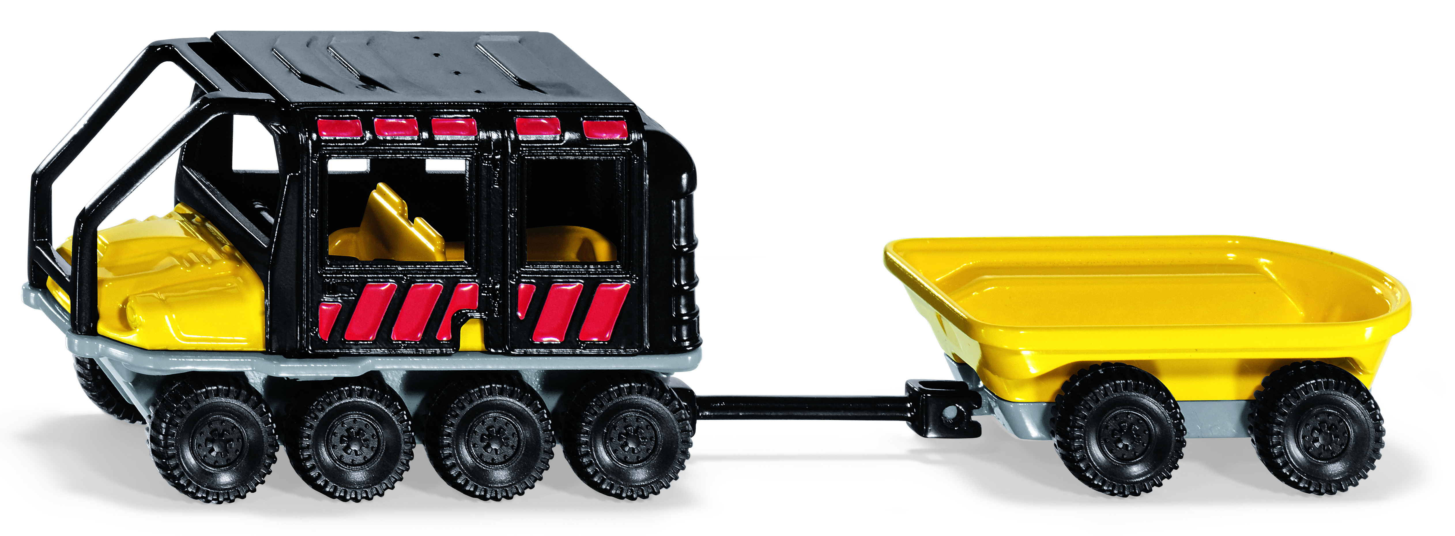 Osiem napędzanych kół i skrzynia biegów z redukcją terenową. Na piasku, w błocie, w śniegu lub w wodzie: ARGO Avenger jest gotowy na każdą przygodę w pokoju dzieci. Solidna metalowa karoseria i kabina chronią śmiałych uczestników wyprawy. Dzięki dużemu rozstawowi kół i nisko położonemu środkowi ciężkości przyczepa jest wyjątkowo stabilna w trudnym terenie. Przyczepę można doczepiać do wszystkich innych pojazdów z serii SIKU SUPER. Razem z Argo Avenger (1386) i John Deere Gator (1481), ARGO Avenger z kabiną i przyczepą idealnie nadaje się na większe wyprawy.