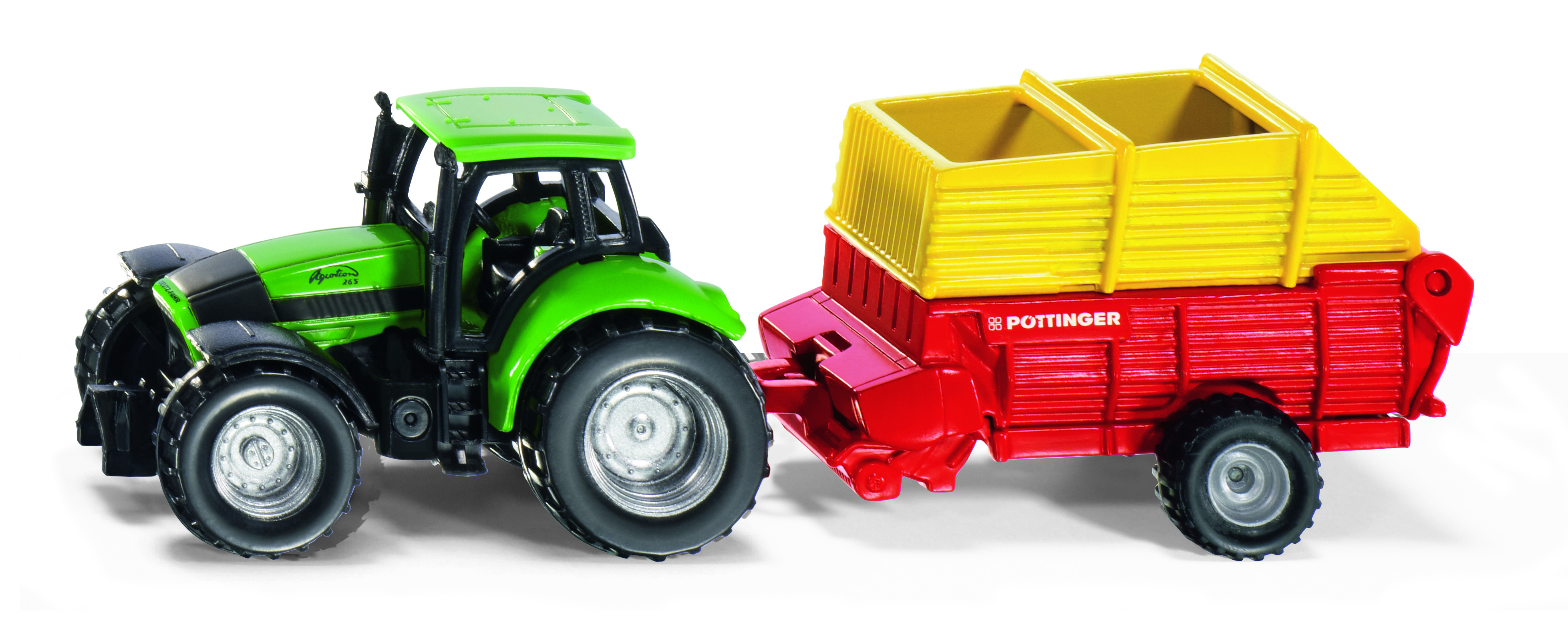 Masywny traktor firmy Deutz ciągnie prężnie przyczepę silosową marki Pttinger BOSS Alpin poprzez świeżo skoszone połacie zieleni, by rozpocząć sianokosy. Ten wyprodukowany z metalu i tworzywa sztucznego zestaw wyposażono fabrycznie w otwieraną klapę tylną