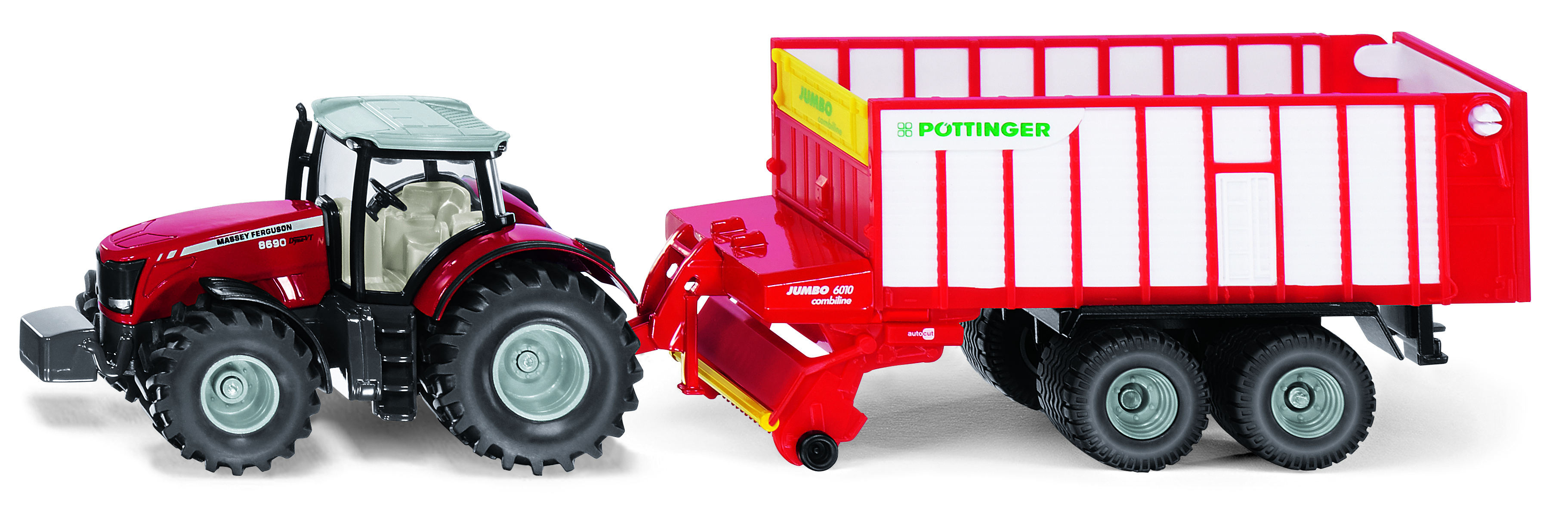 Kombinacja wzbogaca łańcuch maszyn do zbierania żniw z użytków zielonych o kolejny element. Zbieranie i sieczenie siana jest dziecinnie łatwe dzięki ciągniętej przez traktor marki Massey Ferguson sieczkarni Pttinger. Przedni i tylny sprzęg ciągnika Massey Ferguson umożliwia łączenie go z urządzeniami uzupełniającymi i przyczepami w skali 1:50. Opony z pokrytego gumą materiału zapewniają dobrą przyczepność. Wykonana z wytrzymałego plastiku skrzynia kombinacji Pttinger posiada otwieraną tylną klapę.