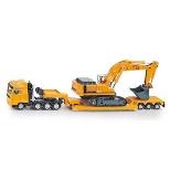 Model ciężarówki wykonany z metalowych i plastikowych części w skali 1:87 z zachowaniem szczegółów pojazdu rzeczywistego, wyposażony w rozkładaną lawetę dostosowaną do przewozu koparki. Stabilna konstrukcja i gumowe koła zapewniają swobodny i bezpieczny przewóz dołączonej do zestawu koparki gąsienicowej, wyposażonej w ruchome elementy umożliwiające nabieranie i przewożenie drobnych przedmiotów.