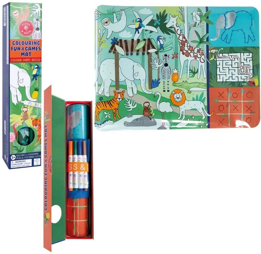 Silikonowa mata do kolorowania, gier i zabaw to świetna, wielofunkcyjna rozrywka, idealna zarówno do domu, jak i na czas podróży. Wystarczy rozłożyć matę, by zanurzyć się w kolorowaniu, łączeniu kropek, pokonywaniu labiryntu czy grze w kółko i krzyżyk. Mata przedstawia zwierzaki z dżungli, w tym lwa, żyrafę, leniwca i inne. Zestaw zawiera 4 kolorowe pisaki suchościeralne oraz poręczną ściereczkę do czyszczenia. Po skończonej zabawie matę można łatwo wytrzeć, zwinąć, spiąć silikonową opaską i schować do praktycznego pudełka. Co najlepsze, matę można używać wielokrotnie!