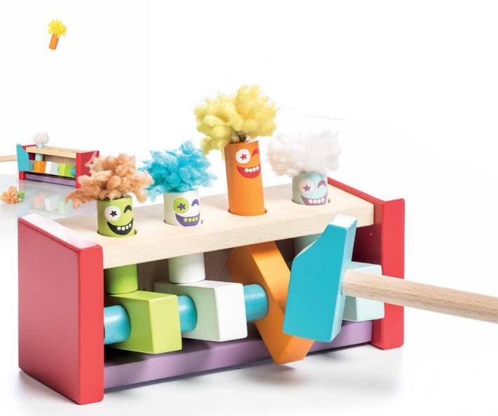 W drewnianym pudełku znajdują się cztery wielobarwne figurki klaunów. Zadaniem maluszka jest uderzenie młotkiem w dźwignię, aby klaun wyskoczył i poleciał. Wszystkie klauny są wielokolorowe, podobnie jak dźwignie. Pomoże to uczynić grę bardziej atrakcyjną i użyteczną dla dziecka.