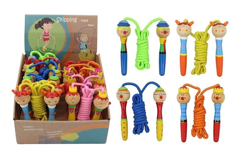 Sznurek: pleciony, nylonowy, grubość 5 mm., Drewniane rączki 13 cm., Długość skakanki: 210 cm., 4 kolory: żółty, zielony, niebieski, pomarańczowy, wym. Opk: 20 x 14 x 20,5 cm., 3+