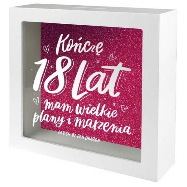 Skarbonka jest wykonana z MDF-u i szkła. Format 15 x 15 x 5 cm.