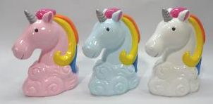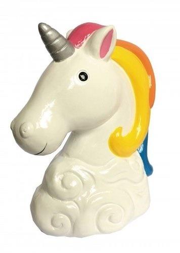 Kolorowa, ceramiczna skarbonka w kształcie jednorożca . Na górze szczelina do wrzucania pieniędzy. Sposobem na wyciągnięcie oszczędności ze skarbonki jest wyjęcie zabezpieczenia od spodu . Dzięki temu skarbonka może służyć przez wiele lat .