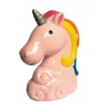 Kolorowa, ceramiczna skarbonka w kształcie jednorożca . Na górze szczelina do wrzucania pieniędzy. Sposobem na wyciągnięcie oszczędności ze skarbonki jest wyjęcie zabezpieczenia od spodu . Dzięki temu skarbonka może służyć przez wiele lat .