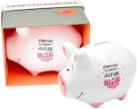 Skarbonka mała świnka SKM-015 "Zbieramy kasę, bo wydaliśmy wszystko na wesele" Ceramiczna skarbonka w kształcie świnki to świetny pomysł na prezent. Świnki są kolorowe i ozdobione zabawnymi tekstami, świetnie się sprawdzą jako dekoracja pokoju. Cechy szczególne: Typ produktu: skarbonka na prezent, Materiał: ceramika Wys. świnki: 8,5 cm. Waga: 214 g Wymiary pudełka: 12,5 x 10 x 10 cm (dł x szer x wys) Opakowanie: kolorowy kartonik Okazja: ogólne życzenia, urodziny