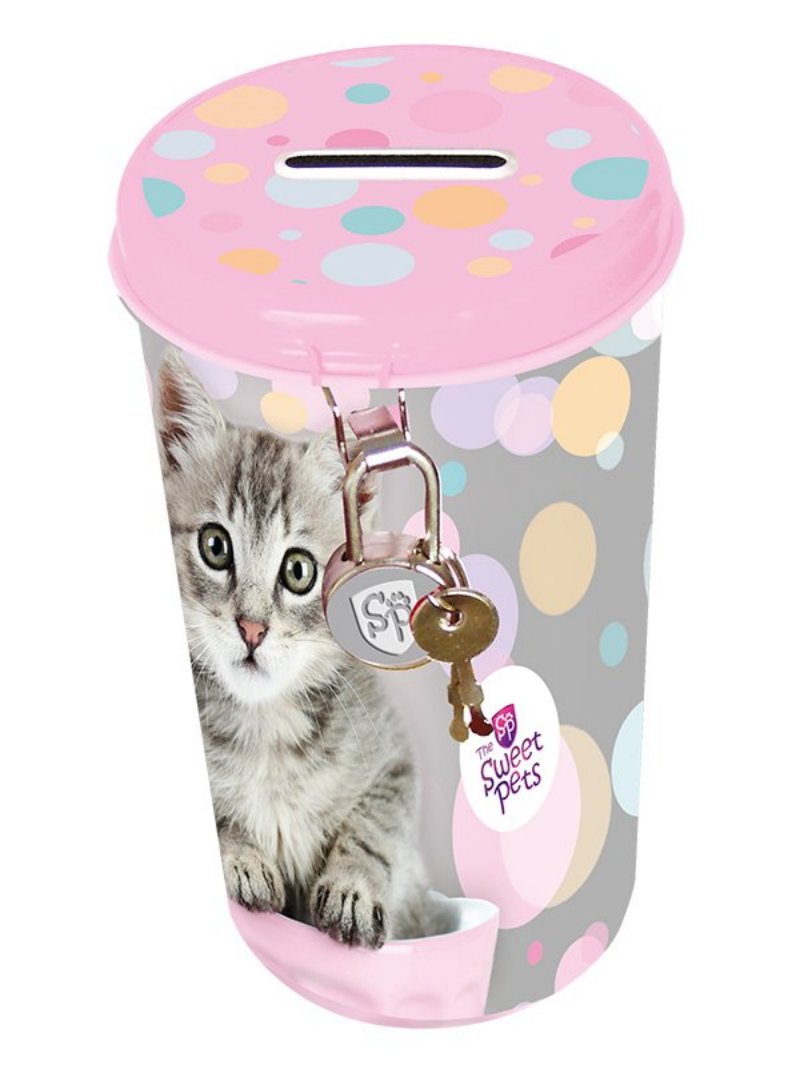 Skarbonka metalowa, zamykana na kłódkę, wielobarwny zadruk Wysokość: 14,5 cm Szerokość: 7,5 cm