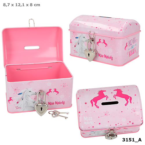 Różowa blaszana skarbonka z motywem Miss Melody (motyw konia) z małym zamkiem.Rozmiar około: 7,5 x 12 x 8 cm (wys. X szer. X gł.)