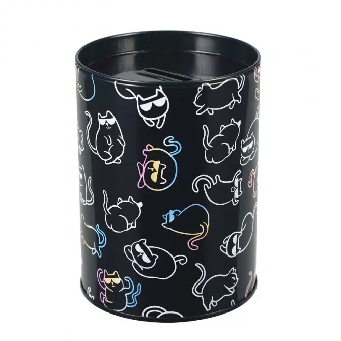 Pojemna skarbonka metalowa okrągła z lakierowanego metalu z otwieranym wieczkiem, która także sprawdzi się jako pojemnik na niezbędne przybory na twoim biurku. Skarbonka STARPAK to idealny pomysł na prezent, który uczy oszczędności i sprawia, że pieniądze są bezpieczne. Skarbonka Kitty holograf.