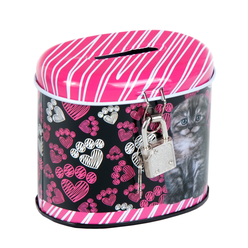 Skarbonka z lakierowanego metalu z otwieranym wieczkiem, zamykana na