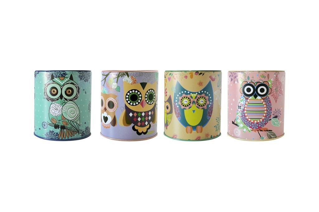 Wielobarwne, metalowe skarbonki o wysokości 10 cm i średnicy 8,5 cm z motywem sowy idealnie sprawdzą się do oszczędzania lub przechowywania przez dzieci monet i banknotów. Otwór znajduje się na górze. Nie jest zamknięta na stałe - otwierana od góry poprzez wyciągnięcie wieczka.