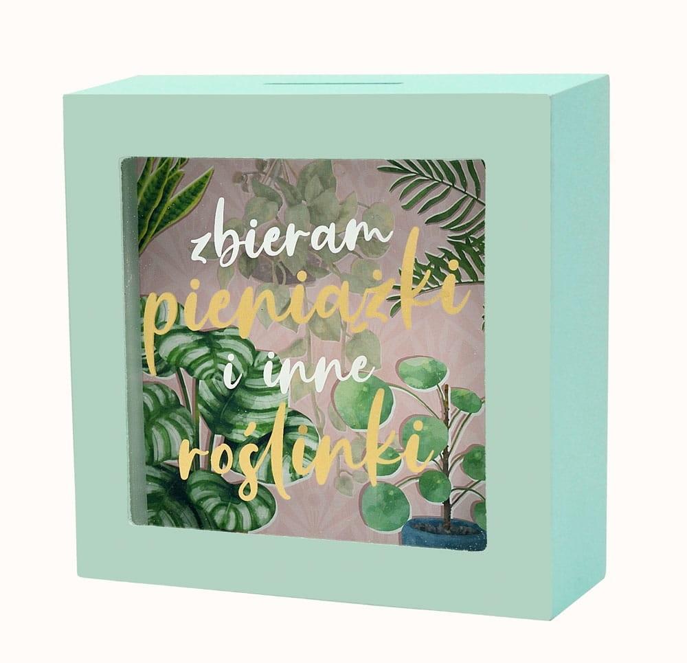 Skarbonka SKARBBOXY SBB-011 Pieniążki i inne roślinki Skarbonka z serii SKARBBOXY to doskonały i niezwykły pomysł na prezent, który idealnie komponuje się w każdym wnętrzu, stanowiąc jednocześnie piękną dekorację. Wykonana z solidnej płyty MDF, skarbonka ta posiada specjalny otwór na górze do wrzucania monet i banknotów. Na szklanej szybce nadrukowany jest ciekawy napis pasujący do różnych okazji, a tło wewnątrz skarbonki zostało starannie zaprojektowane, prezentując przepiękną grafikę, podkreślającą wyjątkowy charakter skarbonki. Dzięki szklanej powierzchni można obserwować, jak skarbonka stopniowo wypełnia się oszczędnościami.. Tył skarbonki jest otwierany, umożliwiając wydobycie zgromadzonych środków na spełnienie jednych marzeń, jednocześnie zachęcając do oszczędzania na kolejne cele. Cechy szczególne: typ: skarbonka do postawienia, wielkość: 16 cm x 16cm, głębokość 5 cm okazja: ogólna