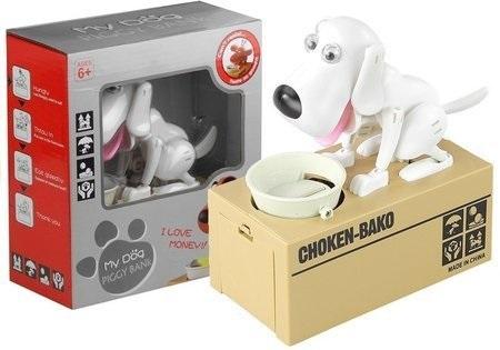 Skarbonka piesek Biały Wesoły piesek jest bardzo głodny i marzy o jedzeniu. Nie może powstrzymać się przed zjedzeniem czegokolwiek, co wpadnie do jego miseczki. Wrzuć tam monetę i obserwuj, jak wpada w szaleństwo jedzenia, zachłannie szukając smakołyku. Ta oryginalna, interaktywna skarbonka jest niespotykanie ciekawa. Ruchomy piesek pomoże zrozumieć dziecku, że oszczędzanie pieniędzy jest bardzo istotne i posiada same zalety - a z wykorzystaniem prezentowanej skarbonki jest bardzo widowiskowe i zabawne. Ta rewelacyjna skarbonka składa się z dużej skrzyni, będącą pojemnikiem na pieniądze dziecka, ruchomej miski z otworem na monetę i energicznego psa, który porusza oczkami, uszkami, językiem i ogonem, generując przy tym dźwięki. Beżowa skrzynka ozdobiona jest napisem Choken-Bako oraz czterema obrazkami, natomiast piesek siedzący na jej pokrywie ma jasnoróżowy język, czarny nosek i piękne, białe umaszczenie. W dolnej części zabawki znajduje się miejsce na dwie baterie 1,5 V AA, które są konieczne do uruchomienia pieska, oraz przełącznik ON/OFF. Z przodu skrzynki umieszczona jest pokrywka, ułatwiająca opróżnienie skarbonki i wydanie oszczędności na marzenie dziecka. Zabawka przeznaczona jest dla wszystkich dzieci powyżej 6 roku życia, zapakowana jest w kartonowe pudełko z witrynką. Uważamy, że skarbonka-piesek jest doskonałym połączeniem nowoczesnego wzornictwa z wielofunkcyjnością. Piesek nie tylko przechowa pieniądze dziecka, ale będzie świetnie prezentować się na jego biurku lub w pokoju, zachęcając do wrzucenia kolejnej monety. Wymiary skarbonki: - cała skarbonka: 15 cm x 8 cm x 16,5 cm, - skrzynia: 15 cm x 8 cm x 6,5 cm, - pies: 13 cm x 5 cm x 12 cm. Wymiary opakowania: - 20 cm x 18 cm x 8,5 cm.