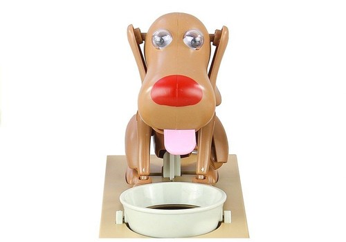 Wesoły piesek jest bardzo głodny i marzy o jedzeniu. Nie może powstrzymać się przed zjedzeniem czegokolwiek, co wpadnie do jego miseczki. Wrzuć tam monetę i obserwuj, jak wpada w szaleństwo jedzenia, zachłannie szukając smakołyku. Ta oryginalna, interaktywna skarbonka jest niespotykanie ciekawa. Ruchomy piesek pomoże zrozumieć dziecku, że oszczędzanie pieniędzy jest bardzo istotne i posiada same zalety — a z wykorzystaniem prezentowanej skarbonki jest bardzo widowiskowe i zabawne. Ta rewelacyjna skarbonka składa się z dużej skrzyni, będącą pojemnikiem na pieniądze dziecka, ruchomej miski z otworem na monetę i energicznego psa, który porusza oczkami, uszkami, językiem i ogonem, generując przy tym dźwięki. Beżowa skrzynka ozdobiona jest napisem Choken-Bako oraz czterema obrazkami, natomiast piesek siedzący na jej pokrywie ma jasnoróżowy język, czerwony nos i piękne, karmelowe umaszczenie. W dolnej części zabawki znajduje się miejsce na dwie baterie 1,5 V AA, które są konieczne do uruchomienia pieska, oraz przełącznik ON/OFF. Z przodu skrzynki umieszczona jest pokrywka, ułatwiająca opróżnienie skarbonki i wydanie oszczędności na marzenie dziecka. Zabawka przeznaczona jest dla wszystkich dzieci powyżej 6 roku życia, zapakowana jest w kartonowe pudełko z witrynką. Uważamy, że skarbonka-piesek jest doskonałym połączeniem nowoczesnego wzornictwa z wielofunkcyjnością. Piesek nie tylko przechowa pieniądze dziecka, ale będzie świetnie prezentować się na jego biurku lub w pokoju, zachęcając do wrzucenia kolejnej monety.