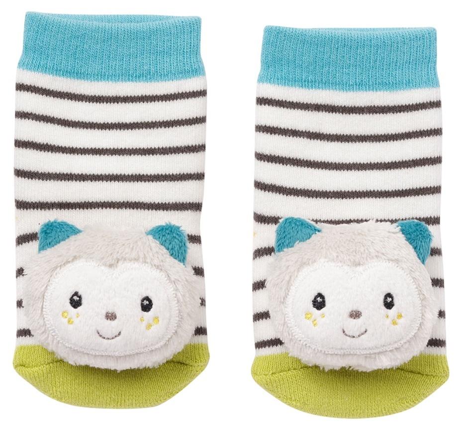 Skarpetki z grzechotką, Kot Yuki, z kolekcji: Aiko i Yuki. Skarpetki z grzechotką w kształcie główki Kota o imieniu Yuki, pochodzącego z Japonii. Wyjątkowo miękki i delikatny materiał przylega doskonale do stópek dziecka i zapewnia przyjemne ciepło przez cały dzień. Śliczne, solidnie uszyte, wyglądają bardzo zabawnie, wydają dźwięk przy każdym ruchu, co powoduje wielkie zainteresowanie malucha. Zmysły dziecka pobudzane są dźwiękiem grzechotki i wywołują u niego chęć kopania oraz przyciągania stóp blisko twarzy. Skarpetki wykonane zostały z materiałów najwyższej jakości, odpowiednie dla dzieci w wieku od 0 do 6 miesięcy. Idealne na prezent. Wykonane z materiałów najwyższej jakości. Stymulują zdolności motoryczne. Można prać. Od 0 do 6 miesięcy. Wszystkie zabawki niemieckiej marki FEHN są bezpieczne dla dzieci od 0 lat. Wykonane są z najlepszej jakości materiałów. Spełniają normy EN71, CE, badane w instytutach ""Stiftung Warentest"" lub ""kotest.