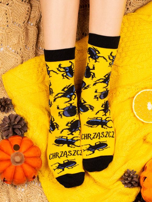 Chrząszcz nie musi brzmieć wyłącznie w trzcinie. U nas wylądował na skarpetach. Szeleszcząco-skrzypiące skarpety CHRZĄSZCZ to nie lada gratka nie tylko dla entomologów, ale także dla koneserów łamańców językowych! Dla waćpani i waćpana Skład: 80% najwyższej jakości bawełna czesana, 17% poliamid (dodaje wytrzymałości), 3% elastan (skarpetka lepiej dopasowuje się do stopy) Nieuciskający ściągacz i komfortowy płaski szew na palcach Wyprodukowano w Polsce Prać zawsze na lewej stronie w temperaturze maks. 40° C, nie prasować.