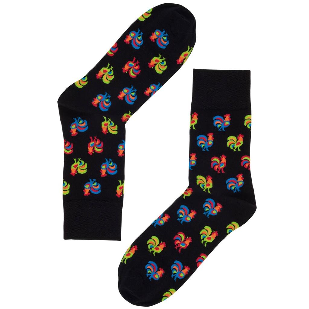 Folk skarpetki w koguciki - czarne: z nadrukowanymi kolorowymi kogutami na czarnym materiale,wzór wyszyty jest na całej skarpetce,wykonane z przewiewnego materiału najwyższej jakości bawełna,skład: 56% bawełna, poliamid 25%, polipropylen 16%, elastan 3%,tradycyjne ze standardową cholewką,wyróżniają się doskonale dobraną oraz intensywną kolorystyką wzoru,będą ciekawym prezentem i regionalną pamiątką z Polski
