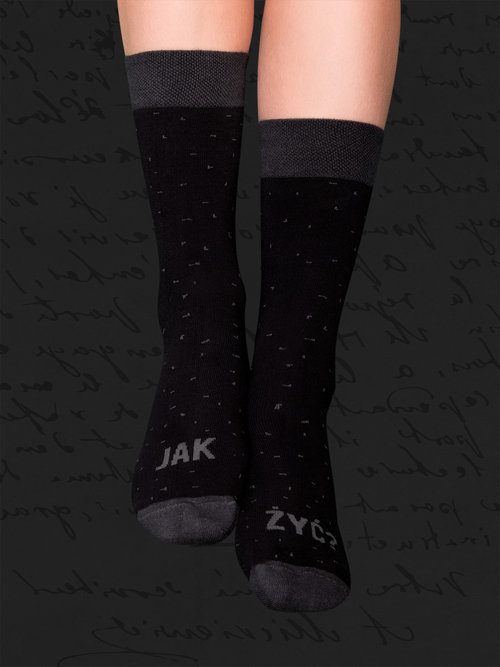 Być albo nie być? Być czy mieć? A przede wszystkim – jak żyć? Oto jest pytanie! Jak większość pytań egzystencjalnych, przychodzi na myśl w trudnych chwilach, jakimi bez wątpienia są wczesne poranki w pracy. Minimalistyczne skarpety JAK ŻYĆ? polecają się na prezent dla pracownika korporacji, kolegi z pracy, studenta filozofii, a także każdego, kto ma problemy z porannym doborem stylizacji. Dla waćpani i waćpana Skład: 80% najwyższej jakości bawełna czesana, 17% poliamid (dodaje wytrzymałości), 3% elastan (skarpetka lepiej dopasowuje się do stopy) Nieuciskający ściągacz i komfortowy płaski szew na palcach Wyprodukowano w Polsce Prać zawsze na lewej stronie w temperaturze maks. 40° C, nie prasować.