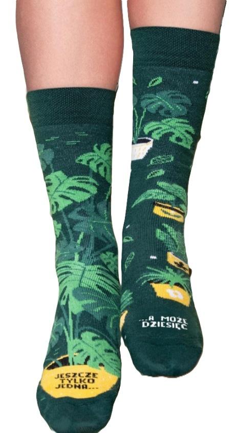 Kolorowe skarpetki JESZCZE TYLKO JEDNA to idealny wybór dla każdej miłośniczki roślin, która ma ręce całe w ziemi, głowę pełną planów przesadzania, a serce oddane swojej domowej dżungli. Nasze skarpetki są ozdobione motywem uroczej monstery i świetnie uzupełnią stylizację każdej plantmaniaczki. Z nimi zawsze będziesz gotowa na kolejną roślinną przygodę!