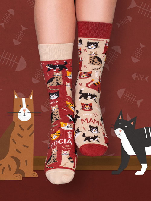 Czy KOCIA MAMA to najważniejsza rola w Twoim życiu? Jeśli tak, nasze skarpety stworzyliśmy z myślą o Tobie! Uroczy wzór w kotki (zarówno w kocie łby, jak i kocie grzbiety) to niezbędny dodatek do stylizacji każdej kociary. Z pewnością doceni go także Twój grymaśny pupil! Skarpety KOCIA MAMA, jak sama nazwa wskazuje, polecają się na prezent dla każdej kociej mamy. Uwaga – nie opędzisz się od kotów! Dla waćpani Skład: 80% najwyższej jakości bawełna czesana, 17% poliamid (dodaje wytrzymałości), 3% elastan (skarpetka lepiej dopasowuje się do stopy) Nieuciskający ściągacz i komfortowy płaski szew na palcach Wyprodukowano w Polsce Prać zawsze na lewej stronie w temperaturze maks. 40° C, nie prasować.