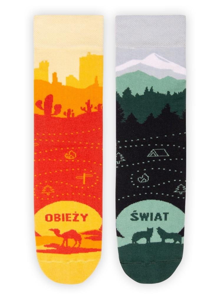 Podróże palcem po mapie? To nie dla Ciebie. Ty kochasz te realne, dalekie i bliskie, ale zawsze połączone z długimi wędrówkami, cieszeniem się każdym widokiem, poznawaniem ludzi i miejsc. Czy to lato, czy zima, Ty jesteś w drodze. Skarpety dla podróżnika OBIEŻYŚWIAT sprawią, że podróże staną się jeszcze przyjemniejsze! Dla waćpani i waćpana Skład: 80% najwyższej jakości bawełna czesana, 17% poliamid (dodaje wytrzymałości), 3% elastan (skarpetka lepiej dopasowuje się do stopy) Nieuciskający ściągacz i komfortowy płaski szew na palcach Wyprodukowano w Polsce Prać zawsze na lewej stronie w temperaturze maks. 40° C, nie prasować.