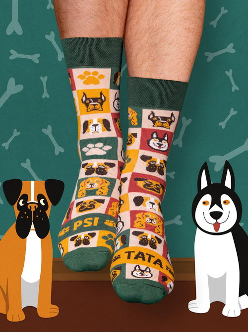 Czy PSI TATA to najważniejsza rola w Twoim życiu? Jeśli tak, nasze skarpety stworzyliśmy z myślą o Tobie! Uroczy wzór w pieski to niezbędny dodatek do stylizacji każdego psiarza. Z pewnością doceni go także Twój pupil! Skarpety PSI TATA, jak sama nazwa wskazuje, polecają się na prezent dla każdego psiego taty. Uwaga – nie opędzisz się od czworonogów! Dla waćpana Skład: 80% najwyższej jakości bawełna czesana, 17% poliamid (dodaje wytrzymałości), 3% elastan (skarpetka lepiej dopasowuje się do stopy) Nieuciskający ściągacz i komfortowy płaski szew na palcach Wyprodukowano w Polsce Prać zawsze na lewej stronie w temperaturze maks. 40° C, nie prasować.