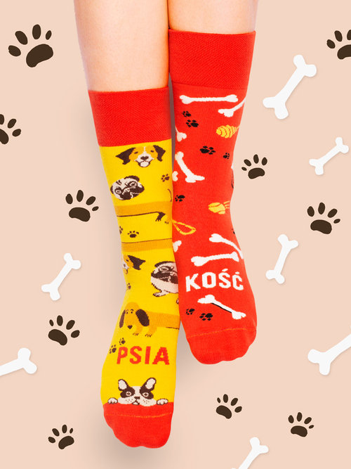 Skarpetki PSIA KOŚĆ to istna gratka dla wszystkich właścicieli szczekających czworonogów oraz dla tych, którzy pieseły darzą miłością szczerą! Na skarpetkach znalazły się sympatyczne mopsy, labradory, buldog oraz baaardzo milusiński jamnik. W tak doborowym psim towarzystwie z pewnością wyróżnisz się z tłumu! Asymetryczne skarpety w psy i w kości to niezbędny gadżet i wyborny pomysł na prezent dla każdego psiarza i każdej psiary. O psiakość! Musisz mieć skarpetki w psią kość! Dla waćpani i waćpana Żółto-czerwone asymetryczne skarpety Skład: 80% najwyższej jakości bawełna czesana, 17% poliamid (dodaje wytrzymałości), 3% elastan (skarpetka lepiej dopasowuje się do stopy) Nieuciskający ściągacz i komfortowy płaski szew na palcach Wyprodukowano w Polsce Prać zawsze na lewej stronie w temperaturze maks. 40° C, nie prasować.