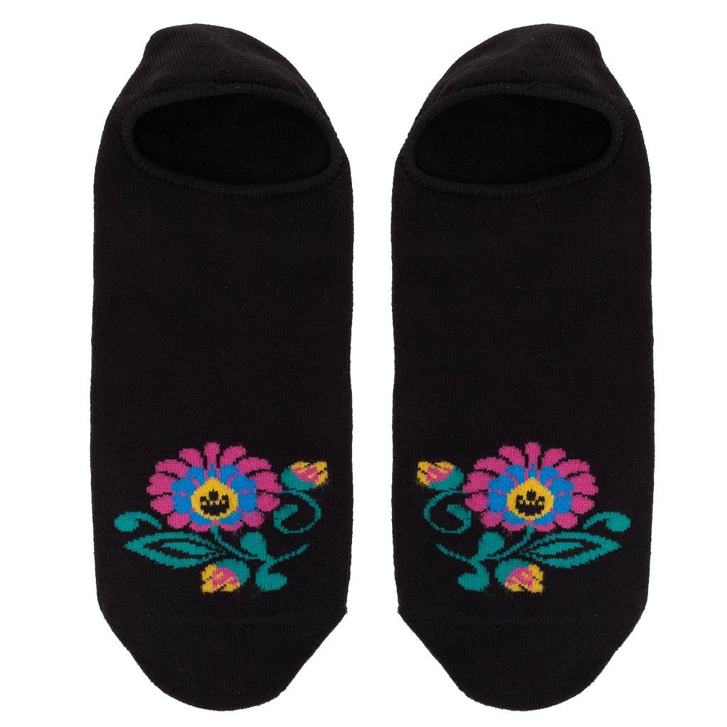 Łowickie skarpety stopki damskie w kwiaty - czarne: z nadrukowanym kwiatowym motywem na czarnym materiale,wzór wyszyty na wierzchu stopy tuż nad palcami,wykonane z przewiewnego materiału najwyższej jakości bawełna,skład: 67% bawełna, poliamid 25%, polipropylen 5%, elastan 3%,